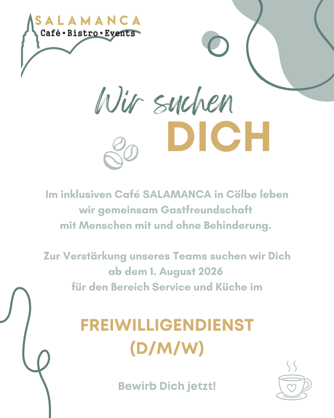 Das Café SALAMANCA ist ein Begegnungsort zwischen Menschen mit und ohne Behinderung. Es bietet einer bunten Vielfalt von Mitarbeitenden aus unterschiedlichen Formen der Arbeitsmärkte eine Möglichkeit der Arbeit und Beschäftigung. Es sorgt durch seine mittelmeermoderne Atmosphäre und durch die zubereiteten Speisen und Getränke aus regionalem Anbau und aus Kooperationen mit regionalen und sozialen Projekten, Firmen, Landwirten und Kaffeeröstereien für Momente des Wohlfühlens. Veranstaltungen und Events dienen neben den Caféöffnungszeiten zusätzlich als Möglichkeit der Inspiration und des Genusses.